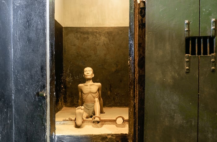 Khu cachot là những ngục tối có diện tích chỉ vỏn vẹn 4m2 với phần tường quét sơn màu đen âm u. Nơi này không có ánh sáng và thiếu không khí, gây cho tù nhân cảm giác như mình đang ở trong một nấm mồ vô cùng bí bách.