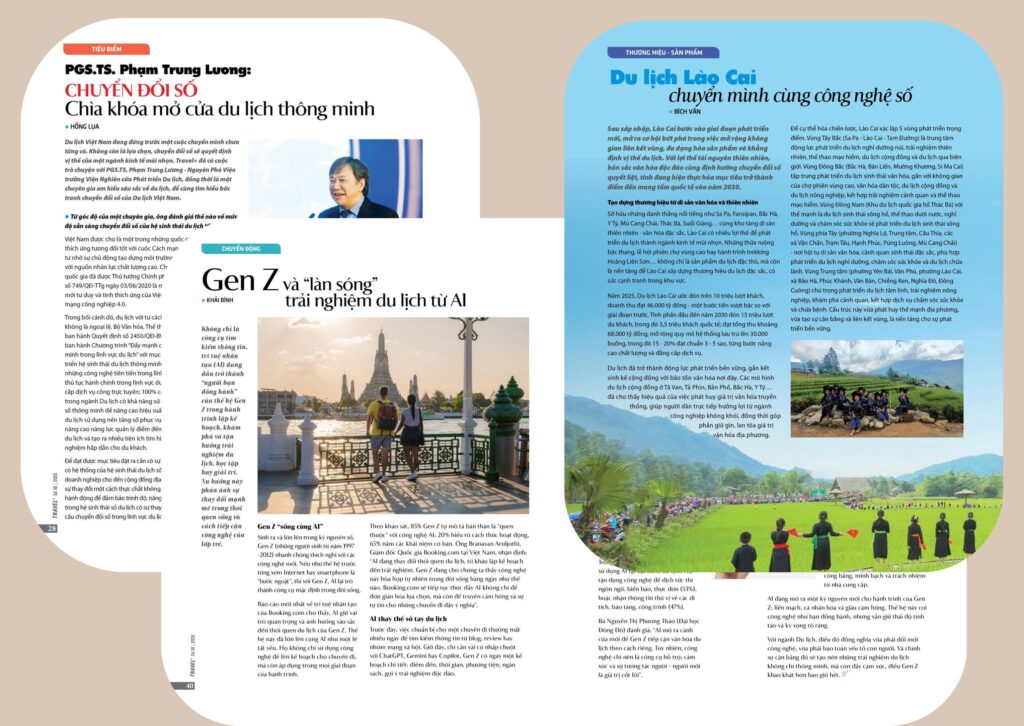Gắn với chủ đề trọng tâm là bài phỏng vấn chuyên sâu PGS.TS. Phạm Trung Lương về hoạt động chuyển đổi số trong ngành Du lịch, là những mô hình thực tiễn như: Hà Nội với hệ sinh thái số vì mục tiêu tăng trưởng xanh; Gen Z và “làn sóng” trải nghiệm du lịch từ AI; Trải nghiệm thông minh – vận hành bền vững tại cơ sở lưu trú du lịch; Du lịch Lào Cai chuyển mình cùng công nghệ số… Những câu chuyện ấy không chỉ cho thấy những bước đi mạnh mẽ mà còn đặt ra bài toán làm sao để công nghệ trở thành công cụ phục vụ con người, chứ không thay thế giá trị cốt lõi của du lịch – trải nghiệm và cảm xúc.