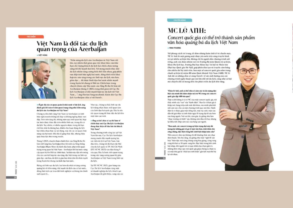 Ấn phẩm tháng này còn có bài phỏng vấn MC Lê Anh về hiệu ứng của các concert quốc gia gắn với quảng bá du lịch; Giám đốc Cục Du lịch Azerbaijan Florian Sengsstschmid chia sẻ về tiềm năng hợp tác giữa Azerbaijan và Việt Nam; CEO Songhan Incubator Lý Đình Quân bàn về đổi mới sáng tạo và khởi nghiệp du lịch.